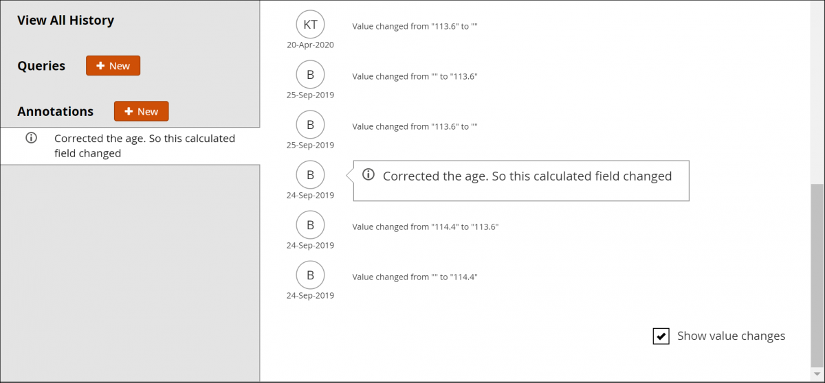 Note: You can view the history for all queries and annotations on a single item by selecting View All History, or you can view the history of each query or annotation individually by selecting that query or annotation from the left panel. If you check the Show value changes checkbox, each value change is included in the history.