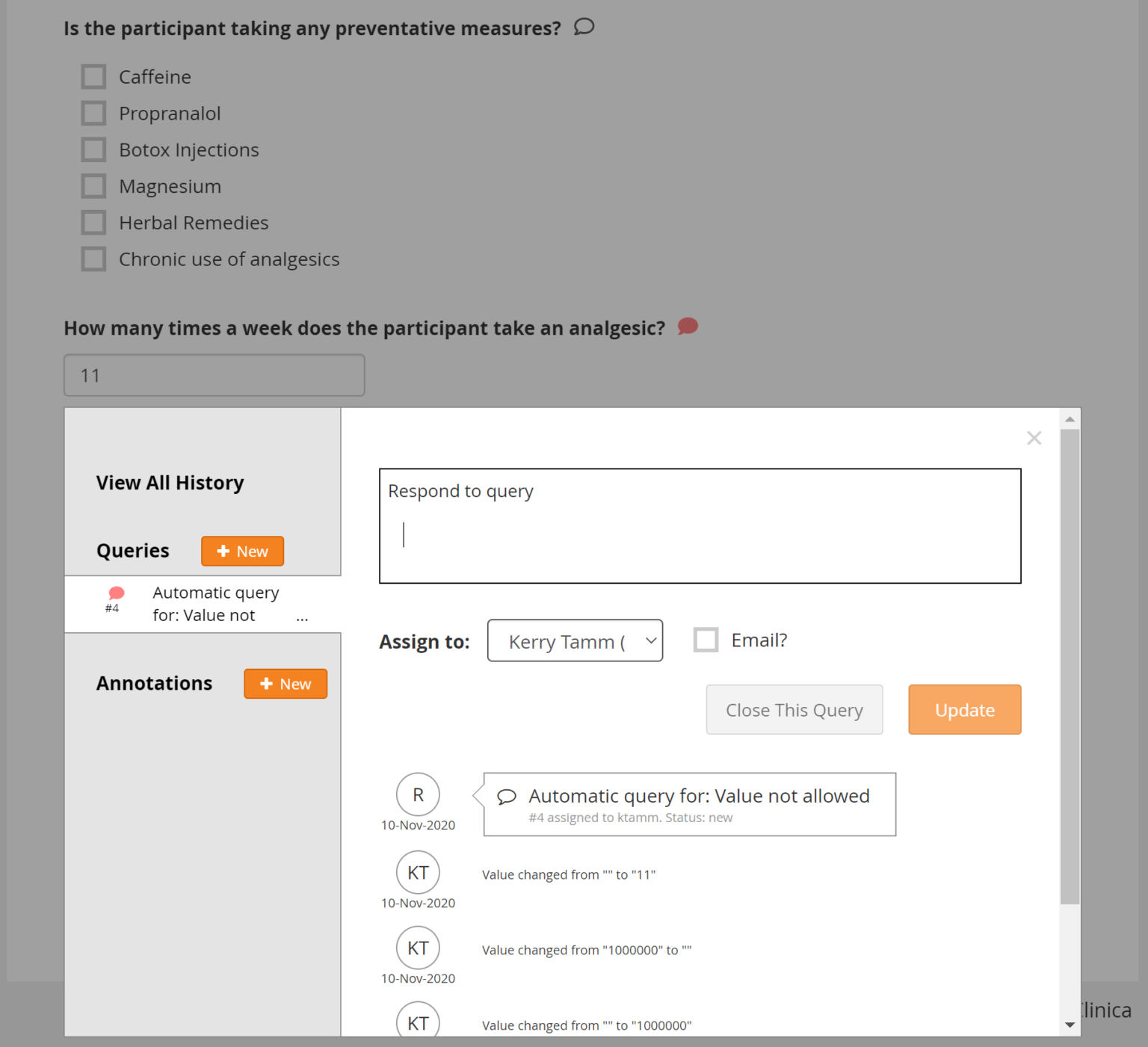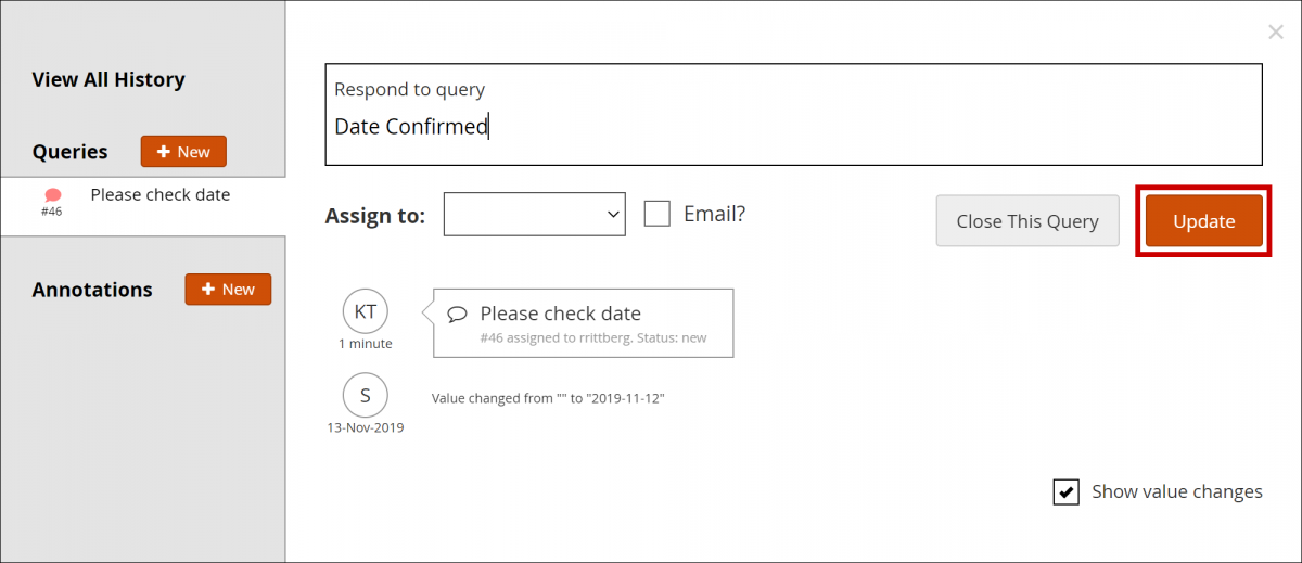 Users can update queries by responding to a query and/or changing data in the form. If data is changed, they will be prompted to enter a reason for change.