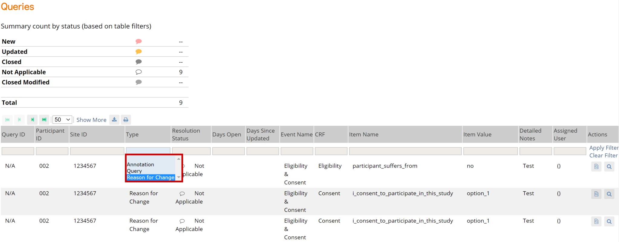 To filter by reason for change, click the gray filter box under the Type column, and select Reason for Change. You can change the view of the Queries screen to filter any column that includes a gray filter box.