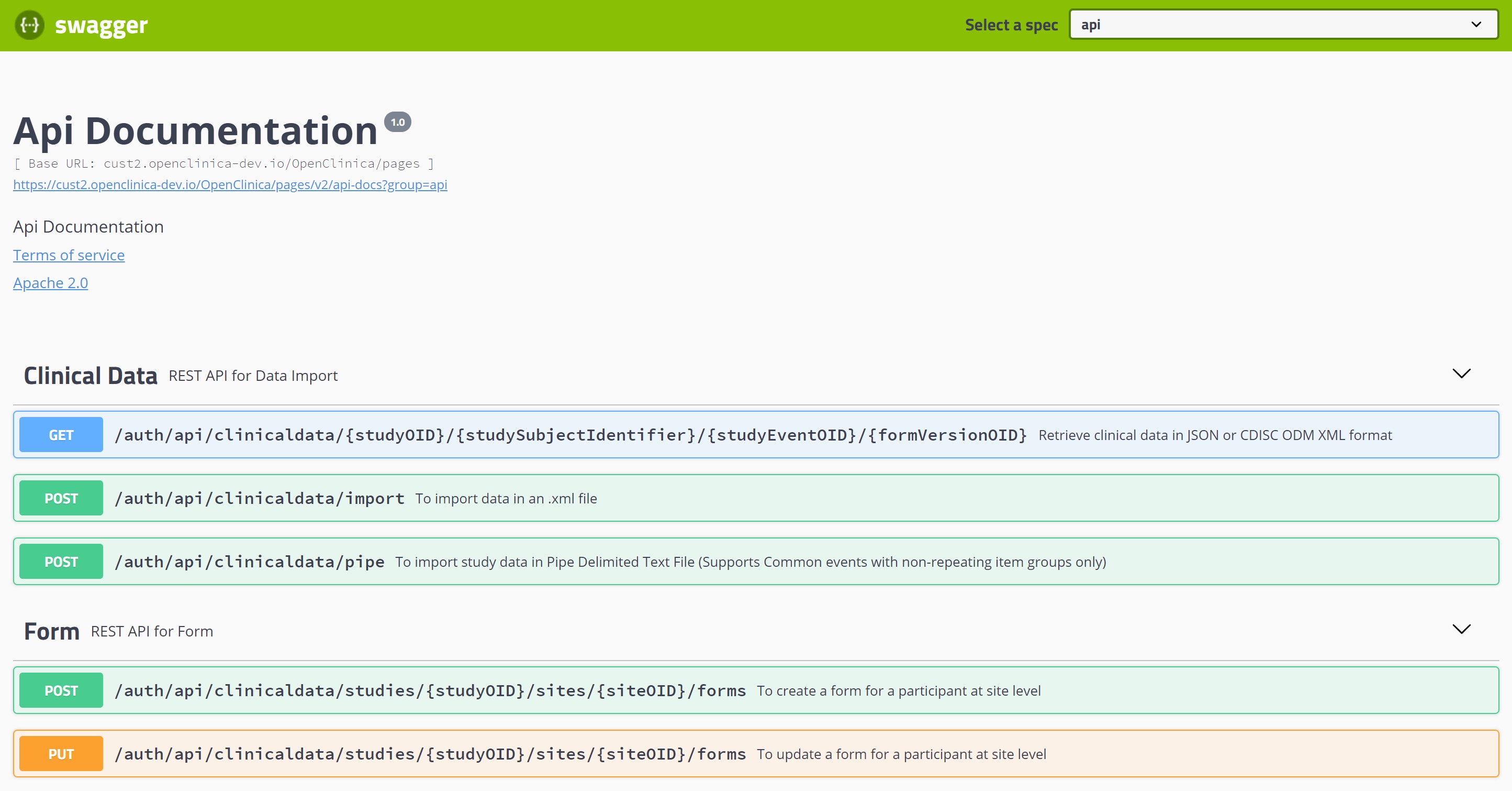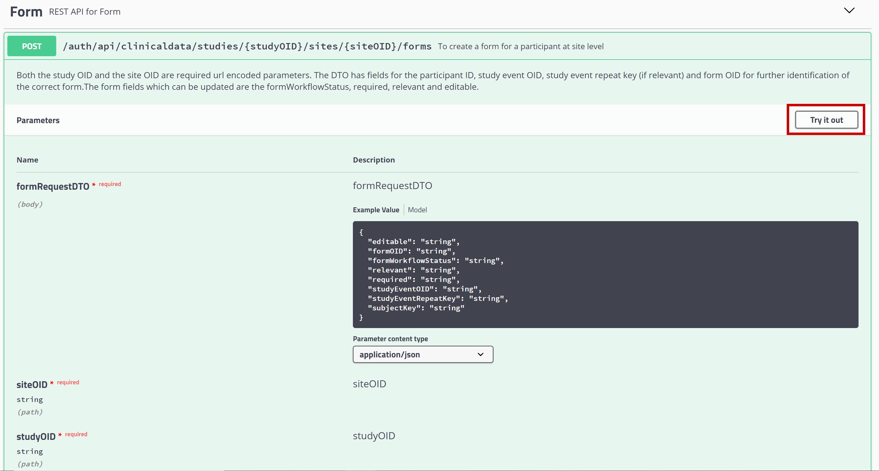 CAUTION: Using the Try it Out interface will actually execute your API calls in the target study environment (based on the study OID you provide, and only when you have a role assigned in the study). Many of OpenClinicas APIs can add an update data in a study. BE CAREFUL AND BE AWARE OF THE CONSEQUENCES, especially if you provide the OID of a study in Production.
