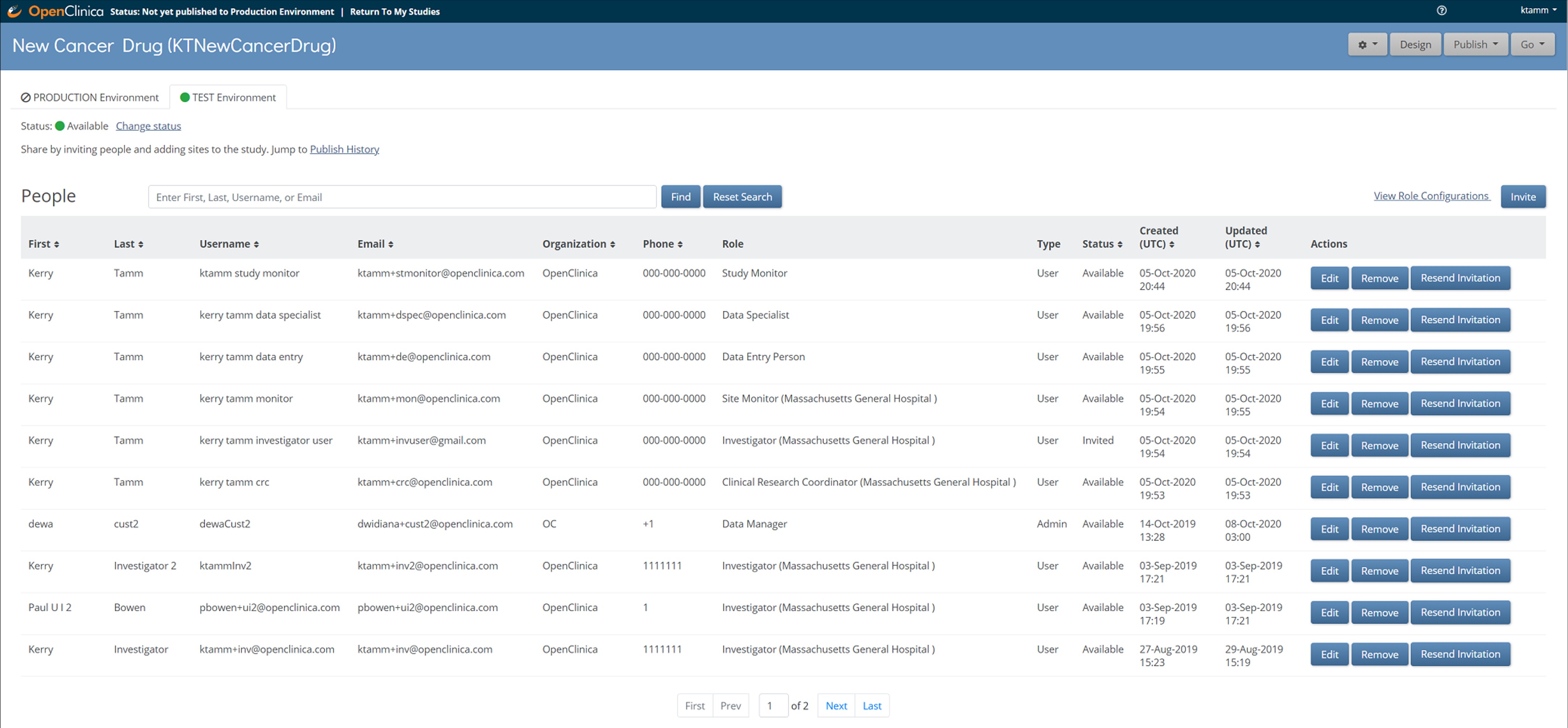 Note: OpenClinica Team users are hidden by default. If you need to view the members of the OpenClinica Team with access to your study, click the Show OpenClinica Team users checkbox.
