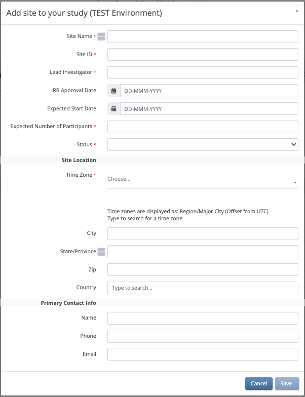 Sites are global, meaning that if you use a site in Study A, you do not need to recreate it for Study B. When adding an existing site to a study, the following fields automatically populate: