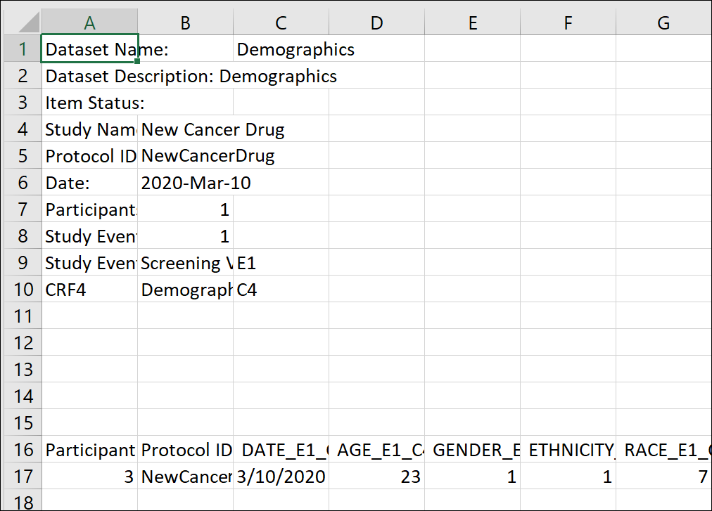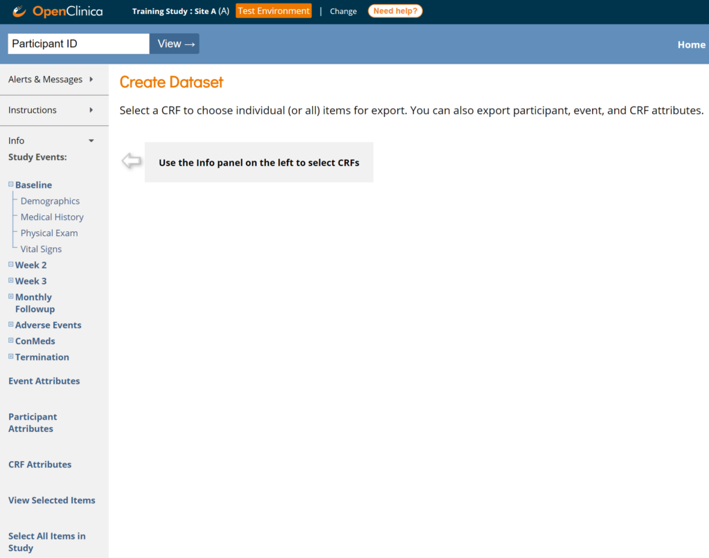 A dataset defines the specific events, forms, items, and attributes you want to include in your output. In addition to form items, you can also add event attributes, participant attributes, and CRF attributes to your dataset. This gives you fine-grained control over which data are included when you generate an extract.