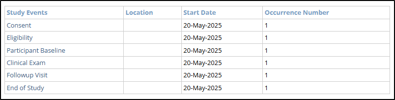 - Occurrence Number: Displays the sequence number for a repeating study event (e.g., “1” indicates the first occurrence). The highest number indicates how many times the event has occurred.