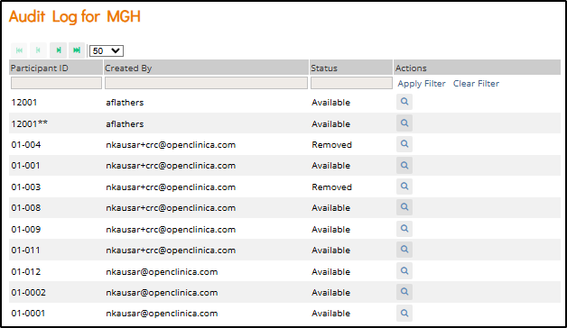 The Study Audit Log page provides high-level information about each participant, offering a central point of access for all participants’ audit logs. The table includes the following elements: