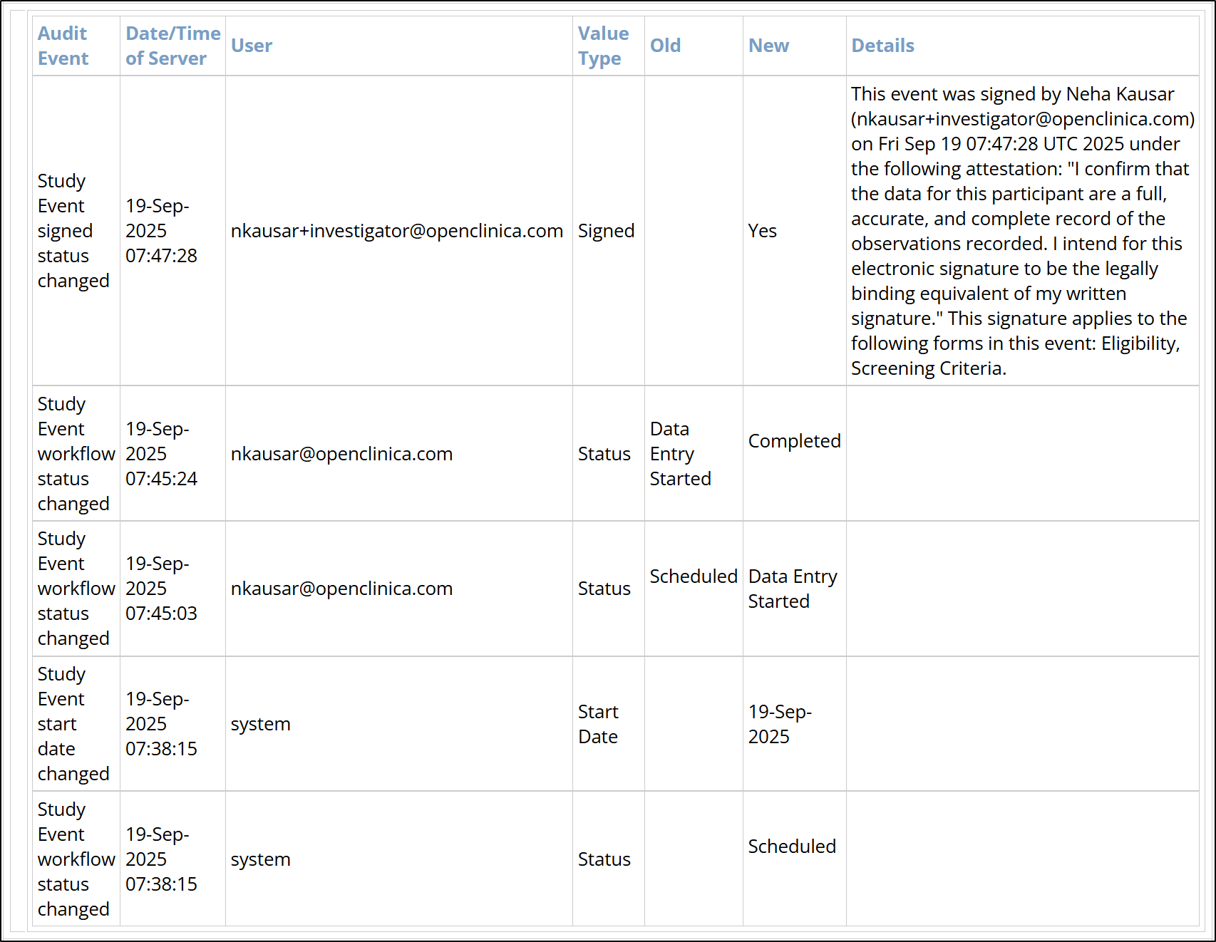 - Details: Populated with the signature attestation when an Investigator or Data Specialist signs the participant’s event.