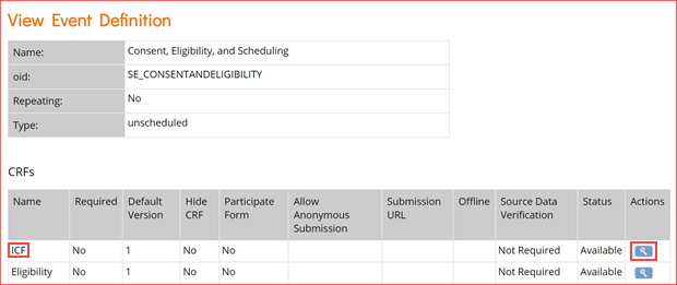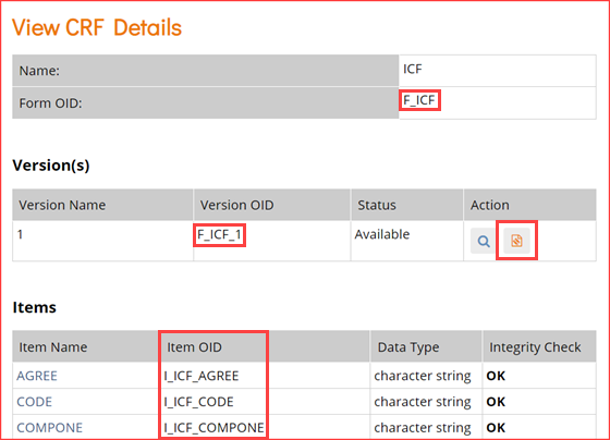 - In the CRFs table, click the view icon for the CRF whose OIDs you want as highlighted in the image above for the first event.