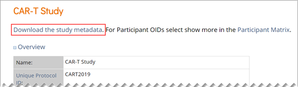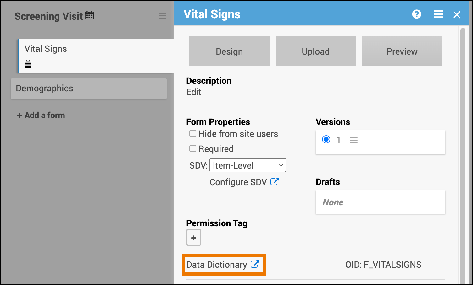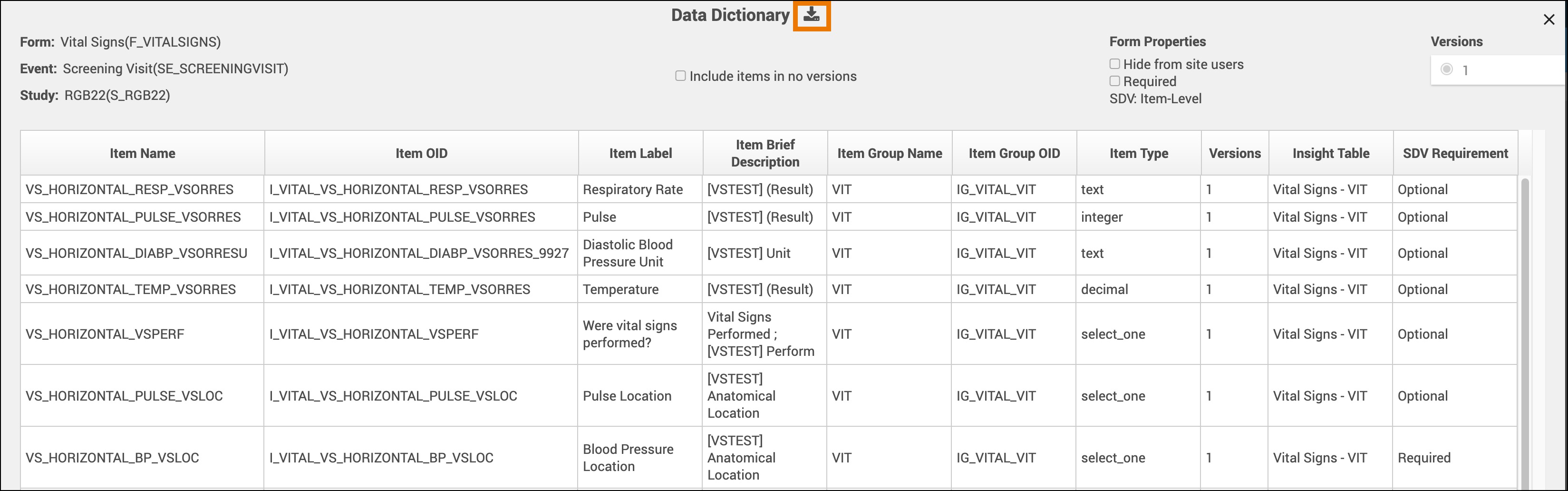 The Data Dictionary gives you form-specific information including form metadata, form properties, and item metadata (such as Item OID, Item Group Name, Item Group OID, Item Type, and Insight Table). The Data Dictionary is available via a link on each form card in Study Designer and can be downloaded as a CSV file to view outside of Study Designer.