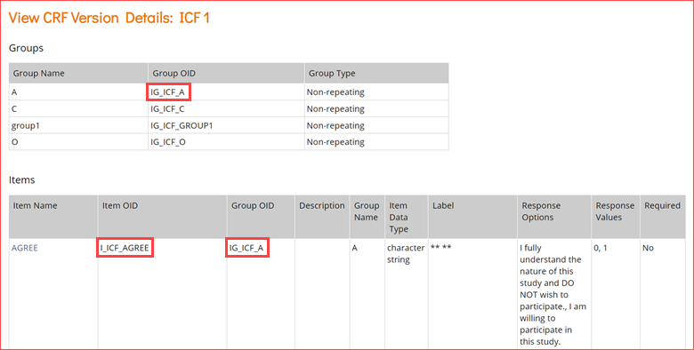 - In the View CRF Version Details page, record the OIDs for the Group(s) and Item(s) (in that order).