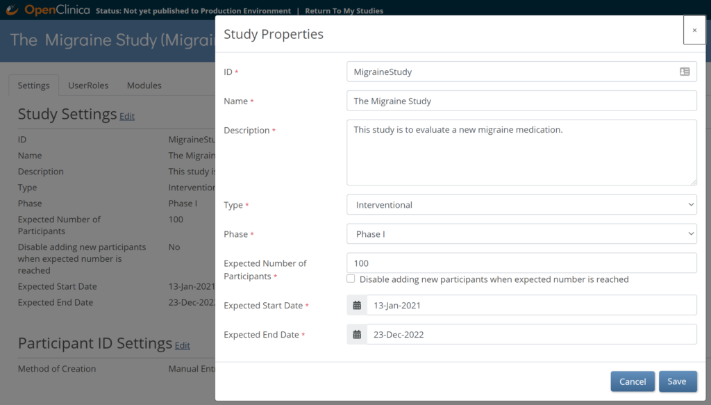 Note: The changes take effect immediately in both the Test and Production environments for that study.