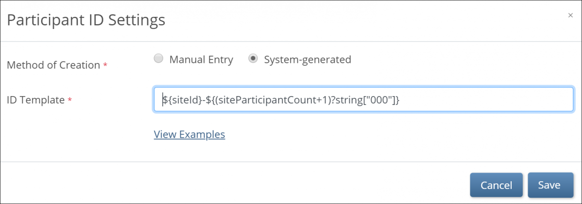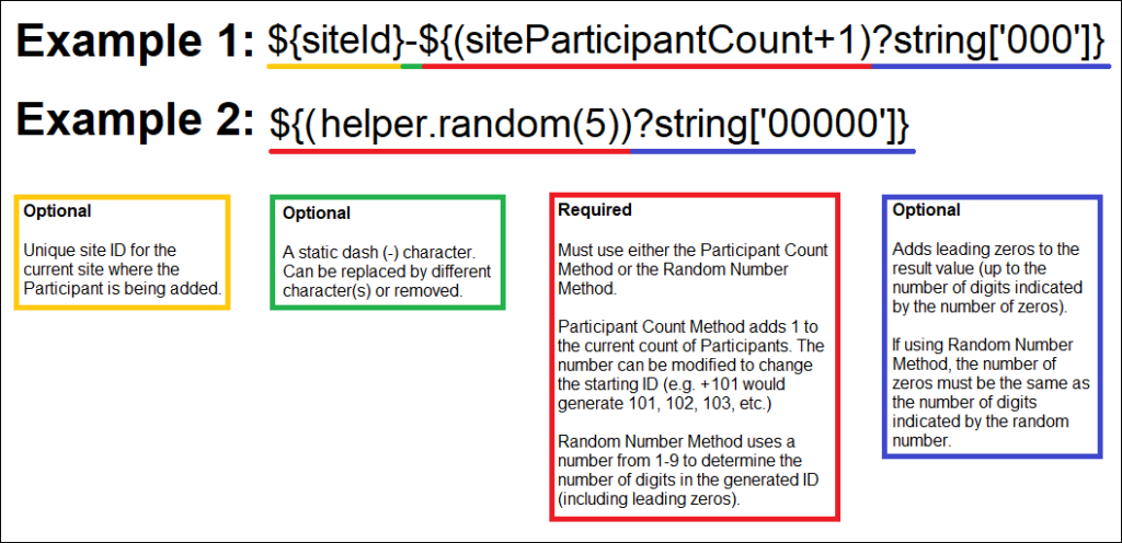 Examples: The Participant Count Method template, ${siteId}-${(siteParticipantCount+1)?string[000]}, for site University Hospital (Site ID = UH) would produce the IDs, UH-001, UH-002, UH-003, etc. For site Central Hospital (Site ID = CH) would produce CH-001, CH-002, CH-003, etc.