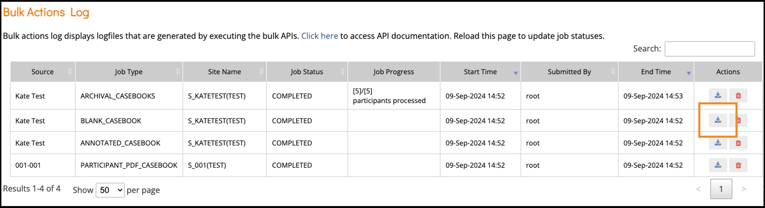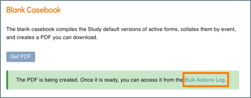 - A green message bar will appear letting you know that the PDF is being generated. This may take some time if it is a large study. Click the Bulk Actions Log link to navigate to the Bulk Actions Log and view the status of the job. Refresh the page if the job has not yet completed.