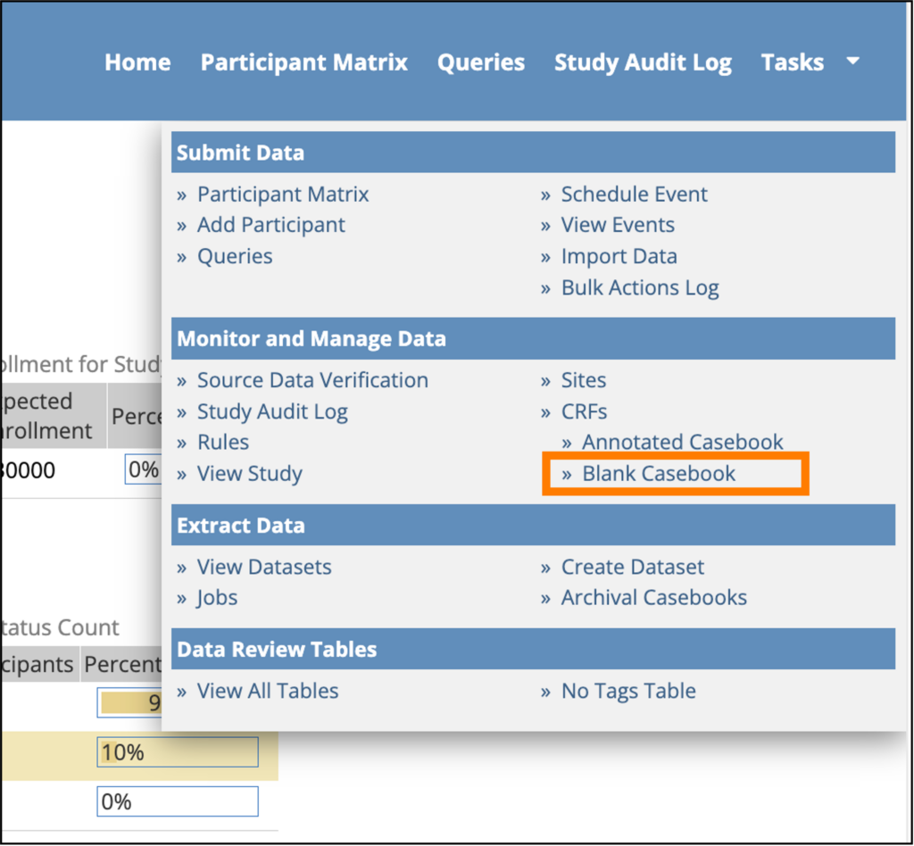 Note: The specific user type dictates where in the Tasks menu the Blank CRF option will appear. Data Manager, Viewer, and Monitor users will see the option under "Monitor and Manage Data" and CRC, Principal Investigator, Data Entry Person, and Data Specialist users will see the option under "Submit Data".
