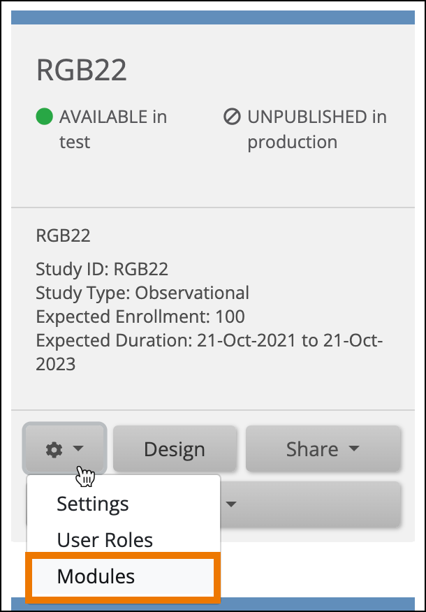 - On the My Studies screen, in Study Designer, or the on the Share screen, click the Settings (Gear) button, and select Modules.