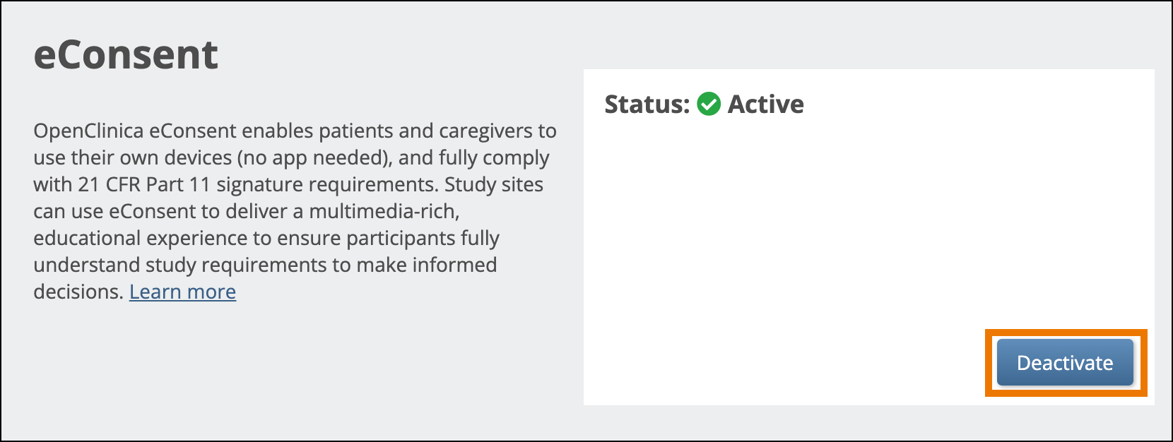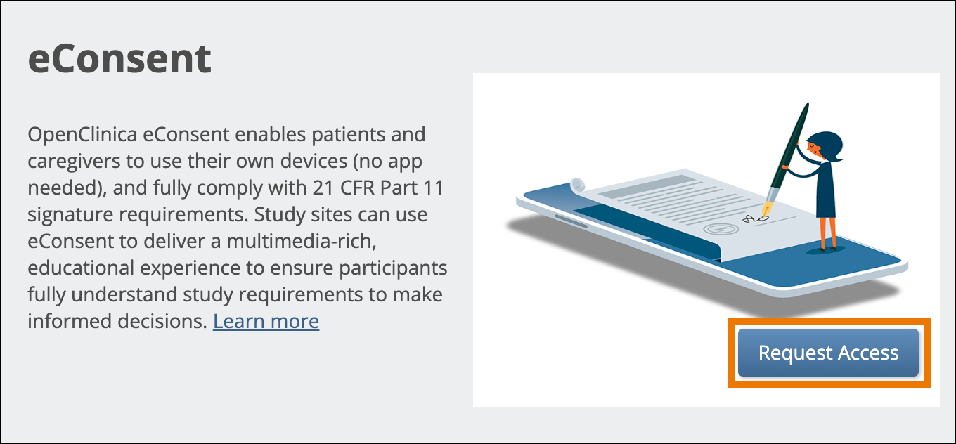 Study-level Data Managers and Administrators can request the OpenClinica Consent module for activation. Consent allows users to get signatures from participants and countersignatures from Investigators and CRCs through electronic means.