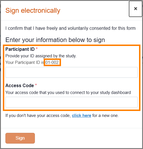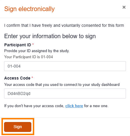 After the participant enters their Participant ID and access code, they will click Sign. The Sign button becomes clickable only after both the Participant ID and access code have been entered.