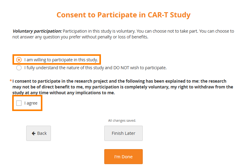 After the participant clicks Let's Go, they will see the form to fill out. For the eConsent form, in addition to any other text or input items in the form definition, the Participant will see the consent checkbox to indicate they are ready to add their formal signature. The text on the form will vary based on your study configuration. In the image below, the question asking whether the Participant is willing to participate in the study is an example of a question configured during study design.