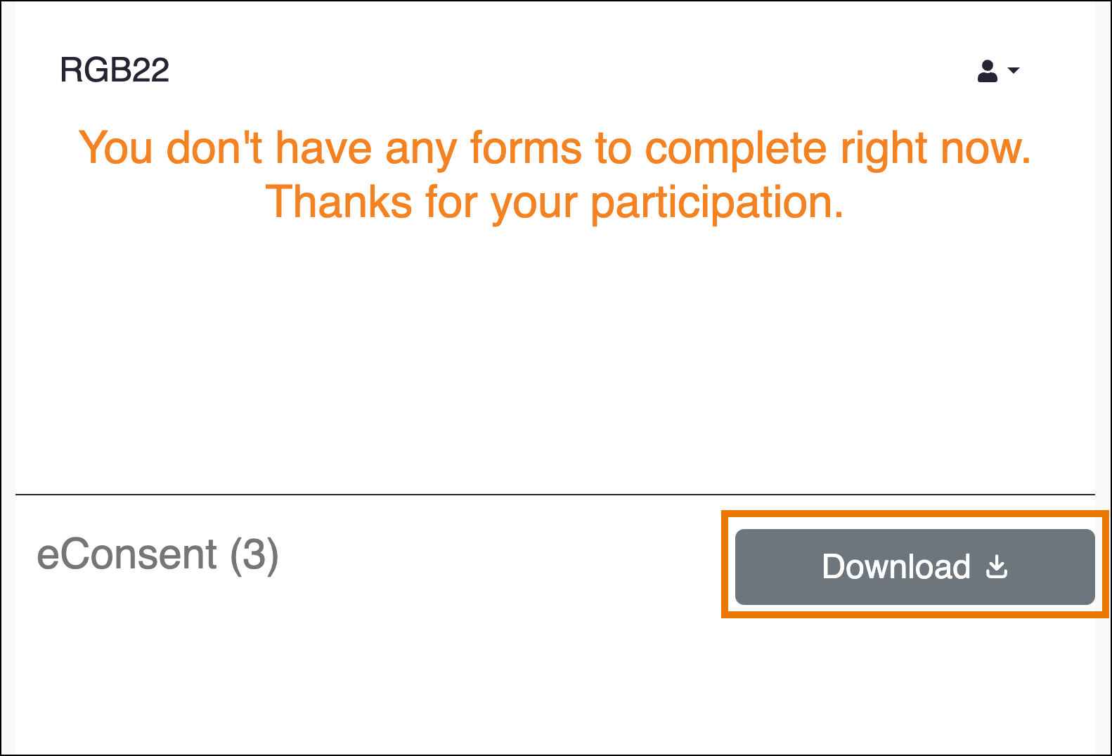 With the eConsent signed, the form will automatically be marked complete. When the participant returns to their dashboard, they will notice the eConsent form will appear at the bottom with a grey download button which allows them to download a copy of their eConsent form. This download option will remain available to the Participant if they return to the dashboard in the future.