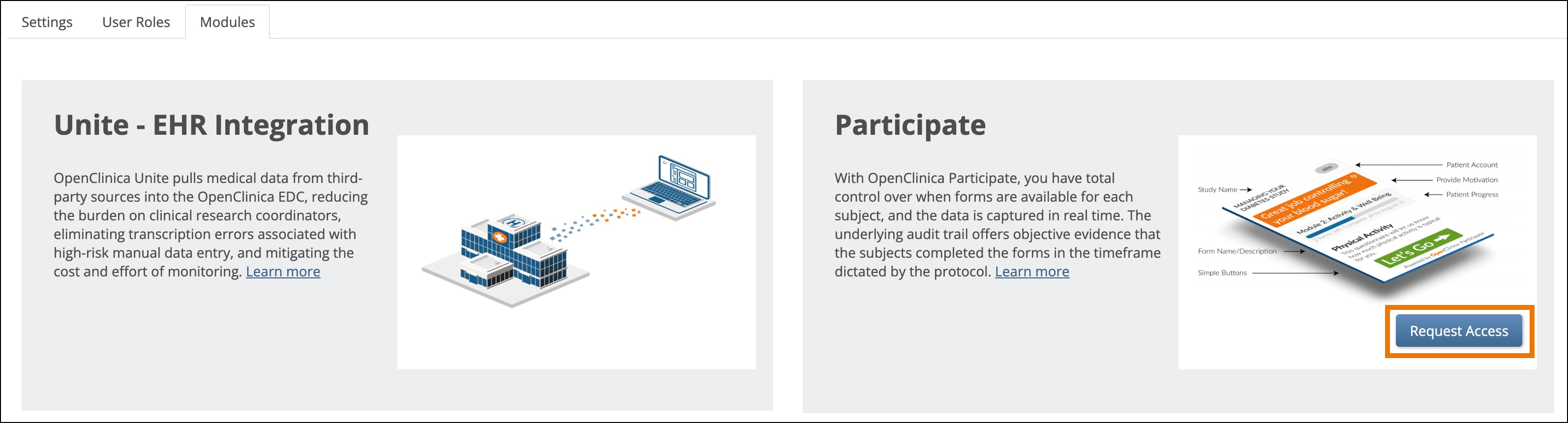 - Click the Request Access button on the Participate Module card.