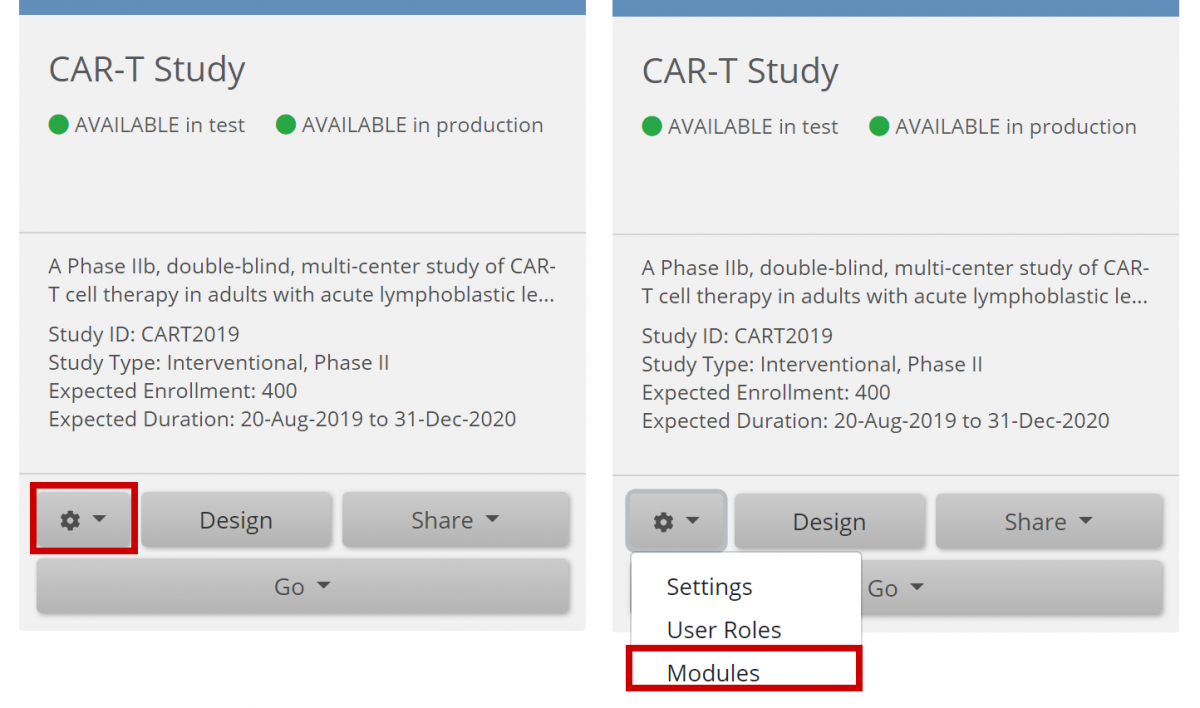 - On the My Studies screen, in Study Designer, or the on the Share screen, click the Settings (Gear) button, and select Modules.