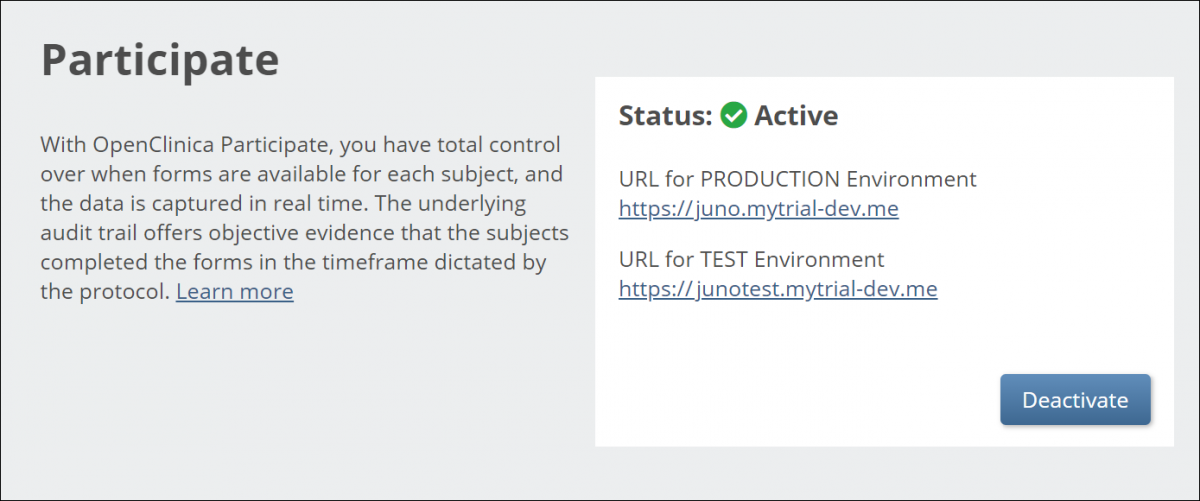 Once your Participate request is approved, the status is set to Active, and Participate is fully available for use in the Test and Production environments for that study.