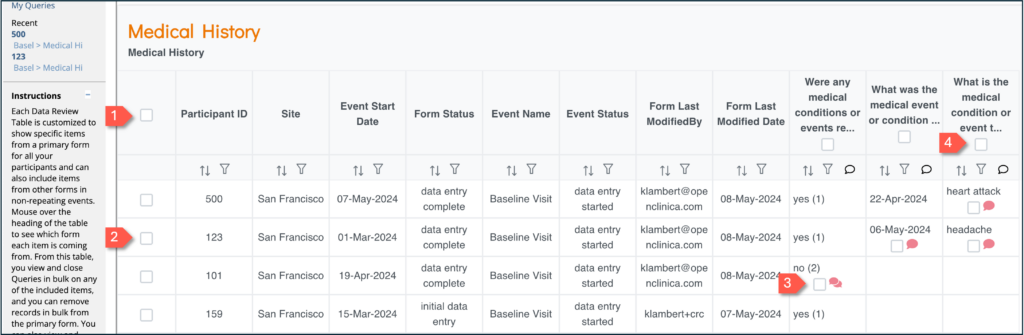 Data Review Tables allow you to review, filter, and take bulk actions on form data within Study Runner. They help streamline data cleaning and query management tasks.