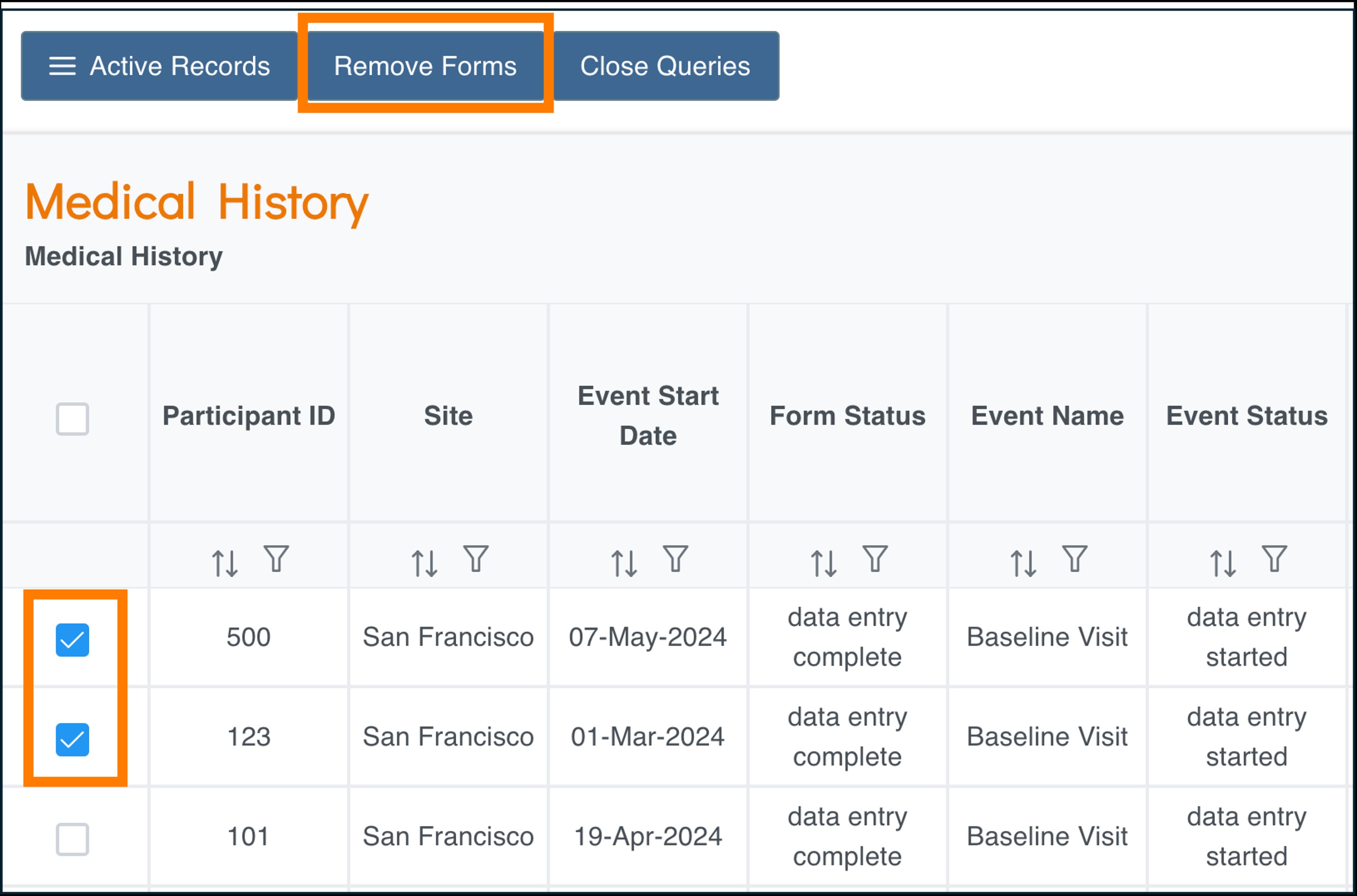 - From Active Records, select the checkboxes for the rows to remove.