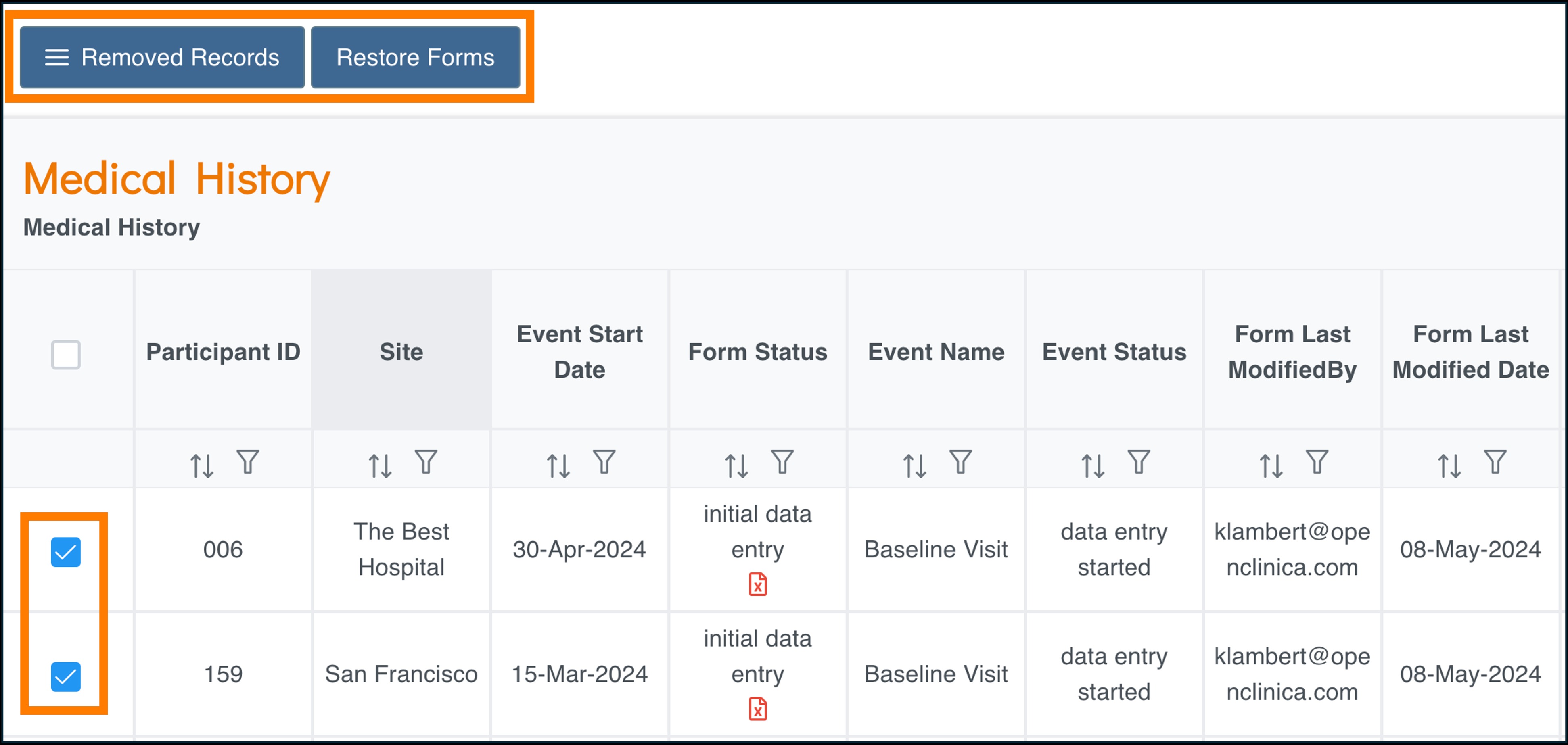 - From Removed Records, select the checkboxes for the forms to restore.