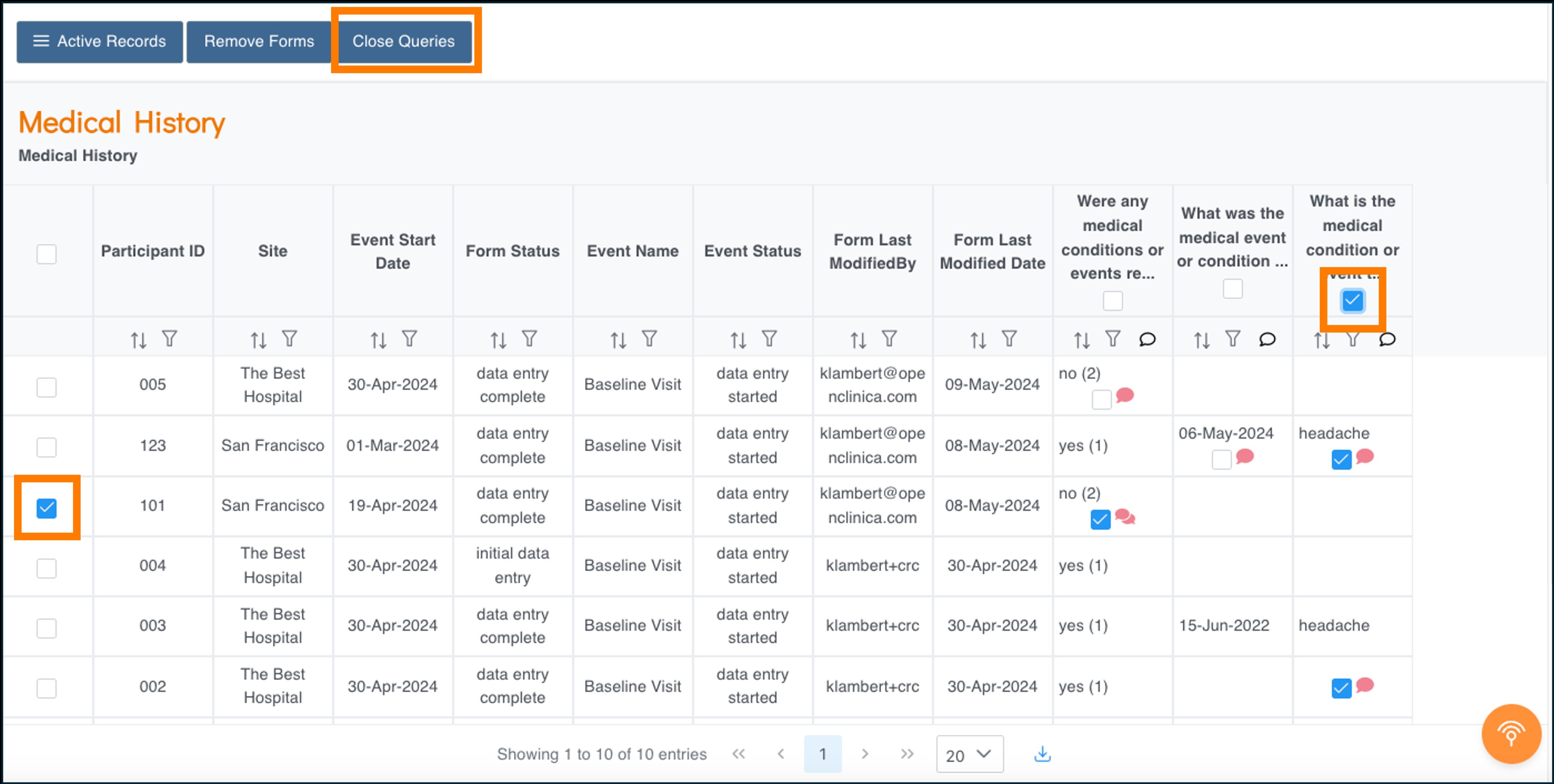 Quickly review imported data in bulk (for example, data from connected devices). If you identify issues, you can remove incorrect form data without opening each form individually. After correcting the issues in the source file, re-import the data accurately. - Bulk-close automatic queries