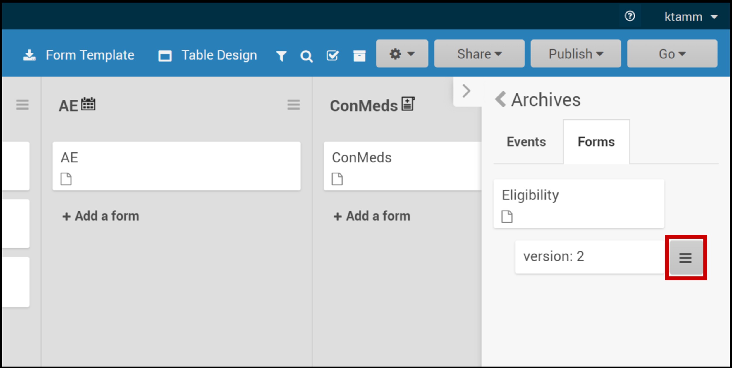 Note: Archiving an Event from within Study Designer removes the Event and all associated Forms from the study. If a study was previously published, the Event was archived, and the study was republished, the Event is no longer available to users. However, archived Events can be restored at any time.