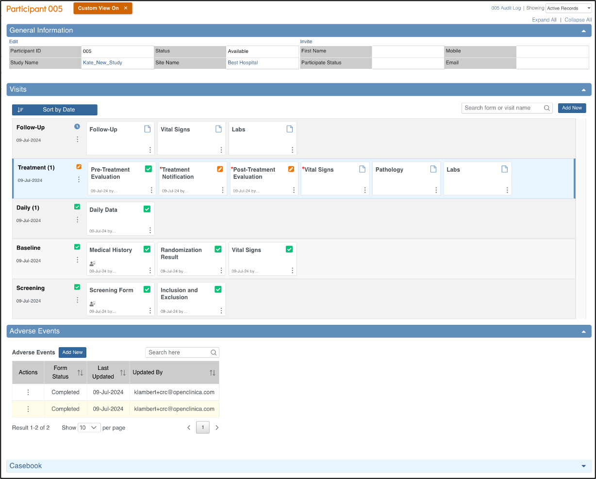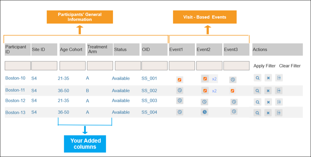 ![]() | Visit | An event that is associated with a visit date. The event can be repeating or non-repeating. | Week 2 Visit (non-repeating); Monthly Follow-Up for Disease-Free Survival (repeating) |