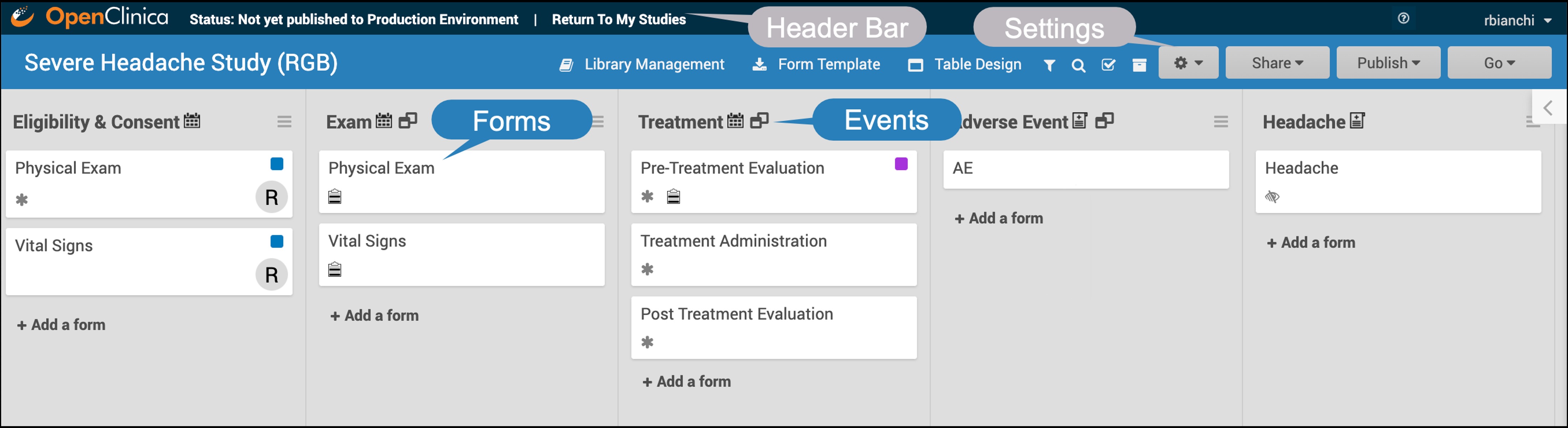 Study Designer contains a set of features that allow you to define, configure, and manage Events, Forms, and other components for your study.