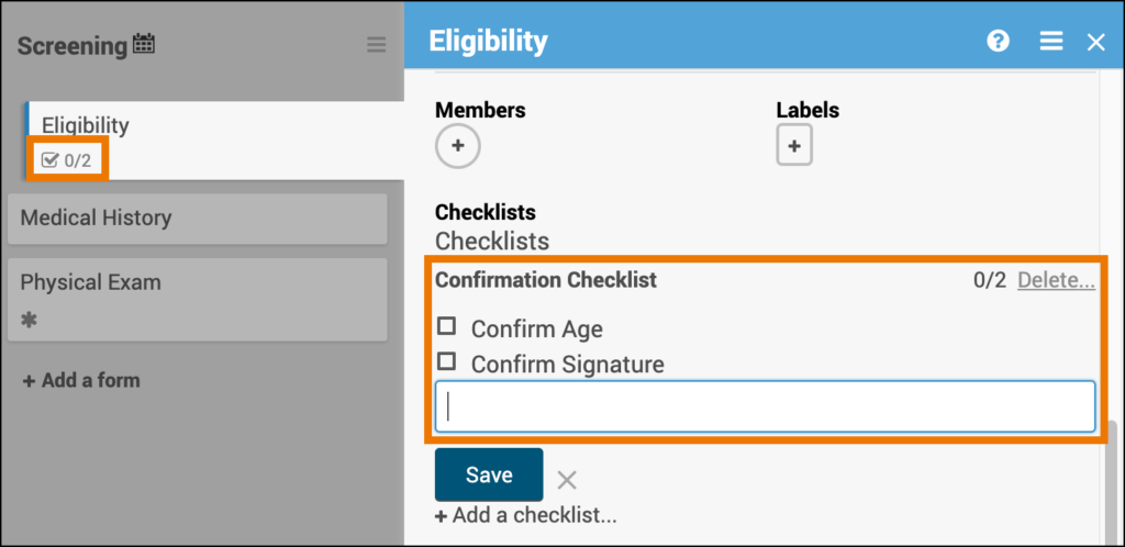 Example: You might use a checklist to keep track of tasks related to completing the appropriate review/approval process to use a Form in your study. You can add a checklist to your Form to keep track of tasks.