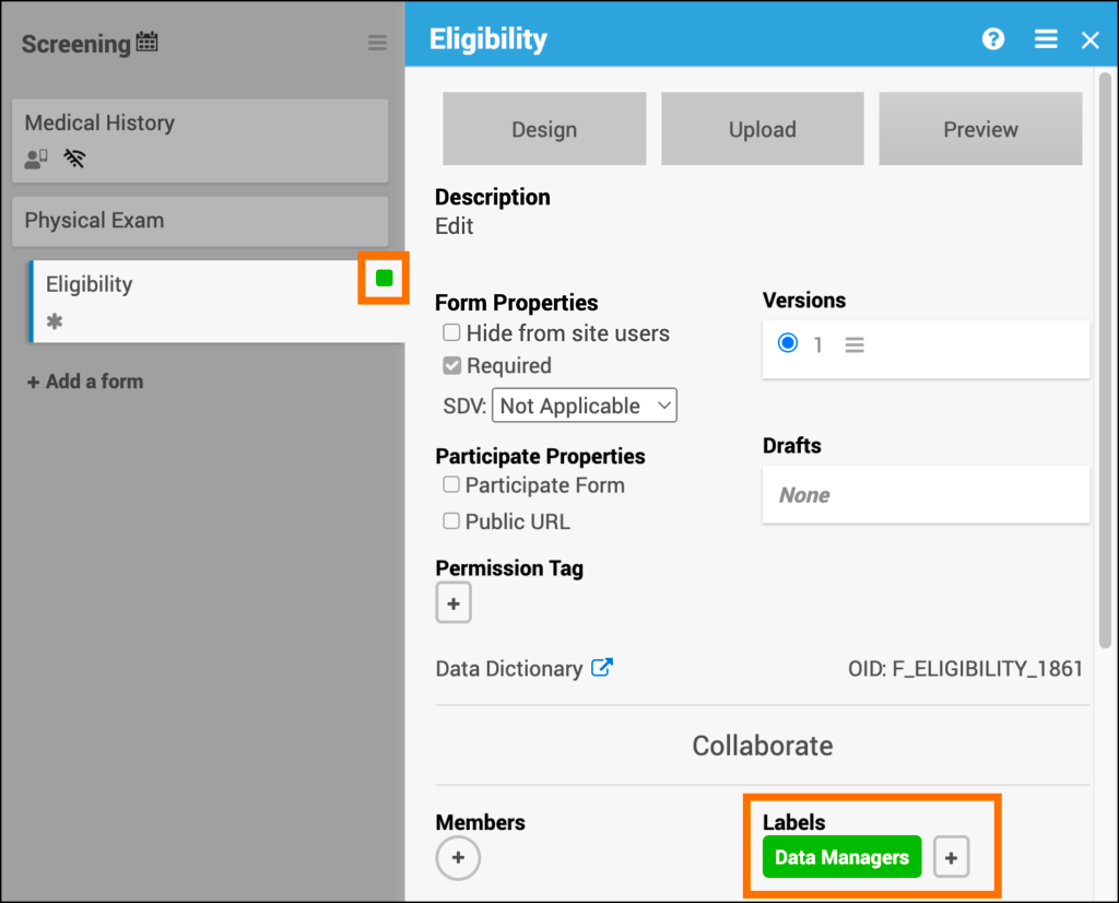 Example: You might use a label to distinguish Forms that apply to the Treatment group from those that apply to the Placebo group. You can add labels to Forms in order to organize them.